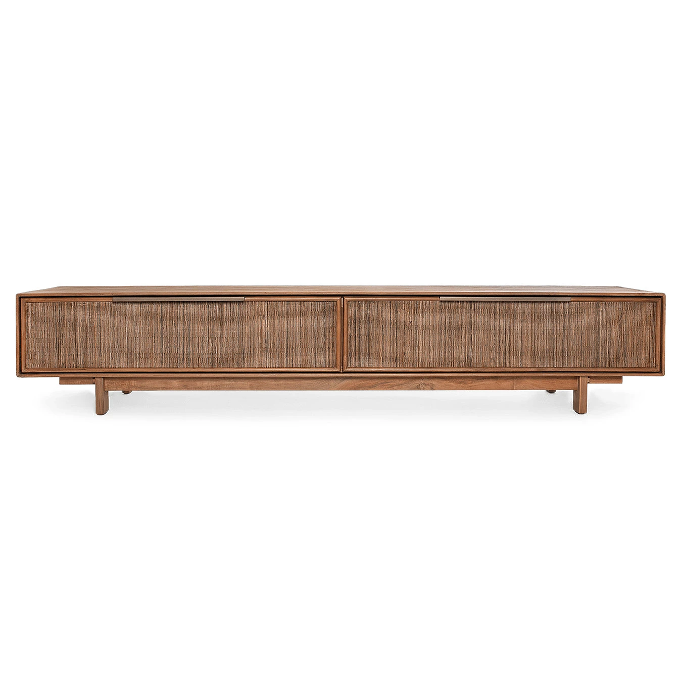 Sleek and mid profile, the Grace Dresser is available in three sizes. Short pedestal leg mounted teak cabinetry, encloses two front drawers, faced in beautifully tactile, woven mid rib coconut fronds, framed with beaded teak with elegant streamline handles, and an open alcove, top shelf area . A retro stylish addition to any room style.