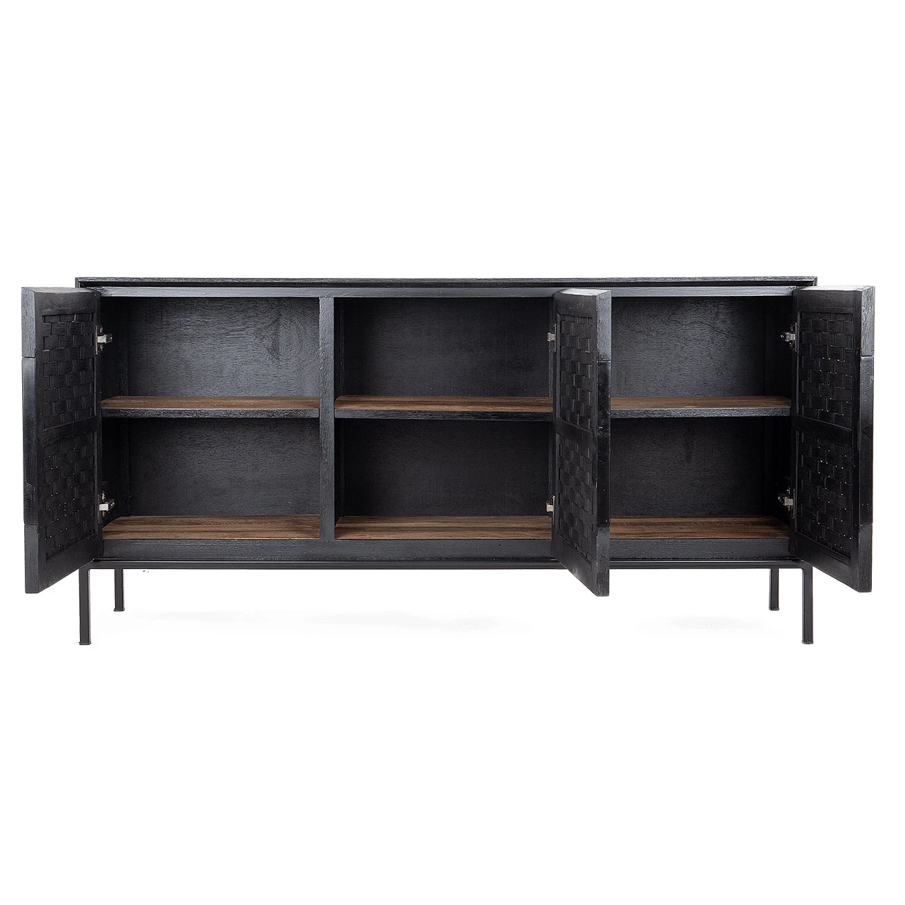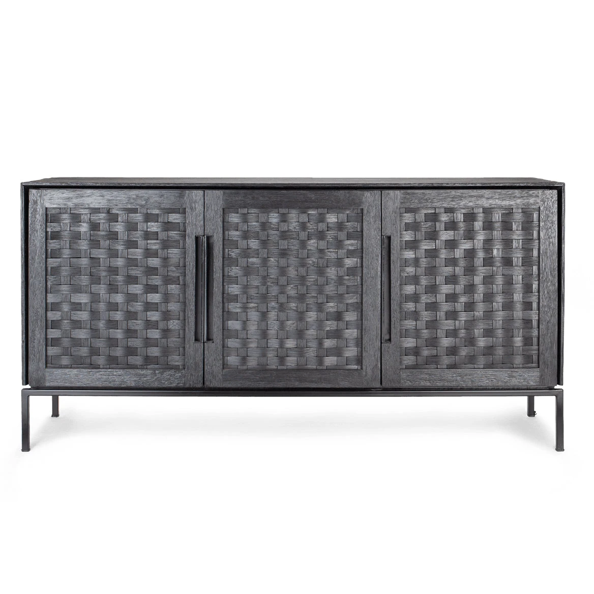 This beautiful three-door Karma Low Dresser is handcrafted, using various craftsmanship techniques. The handmade cabinet exists of reclaimed wood, iron legs and gorgeous textured doors of sustainable, handwoven rattan. The matte black finish contributes to the vintage industrial look, whereas the rattan weave adds elegance to the look.