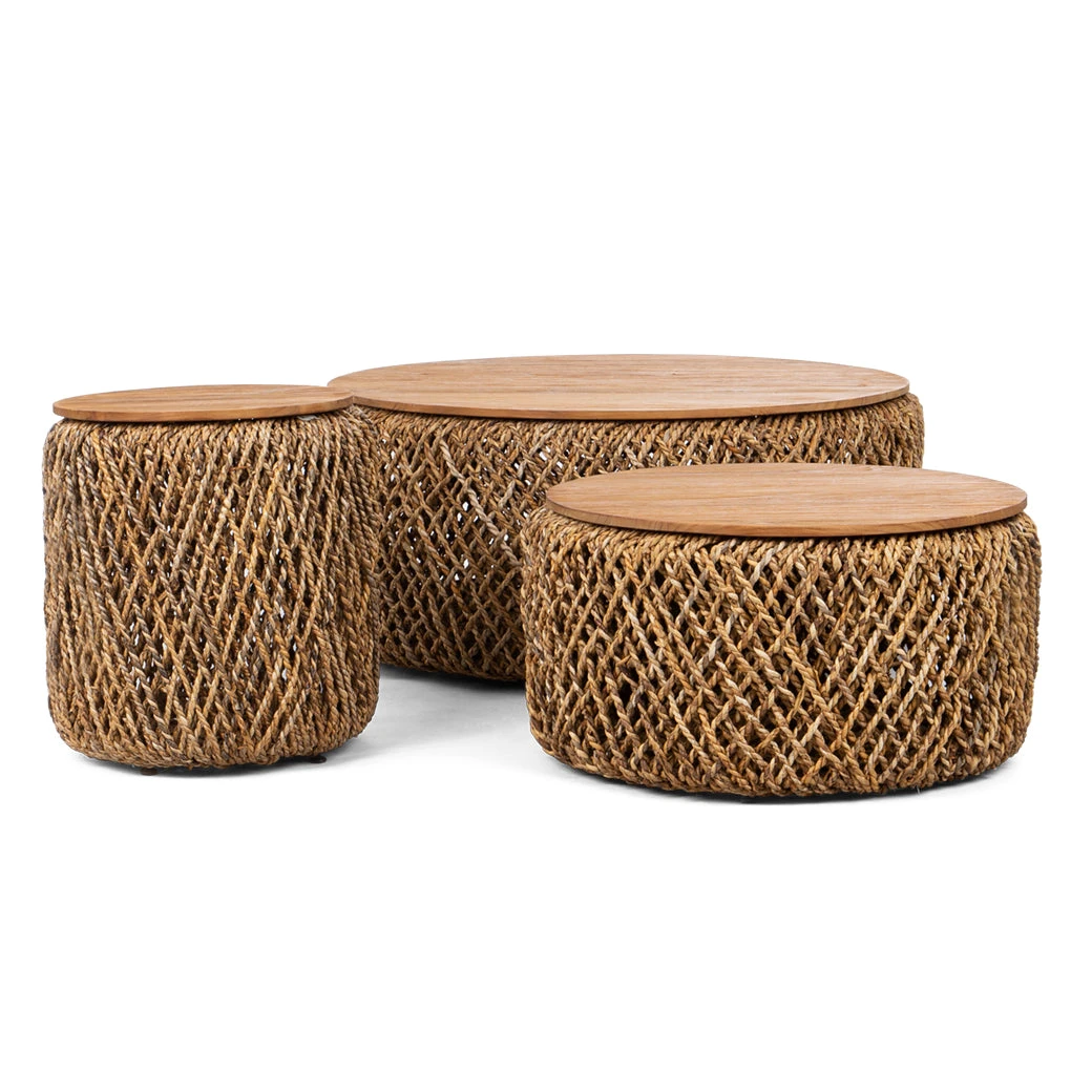 This playful set consists of three small tables, all in different sizes. The versatile pieces can be used as tables, poufs or for decoration. With the top removed, they can even be used as baskets. The tables are made of eco-friendly materials, with the sides decorated with hand-braided abaca fibers and the removable top made of reclaimed teak wood.