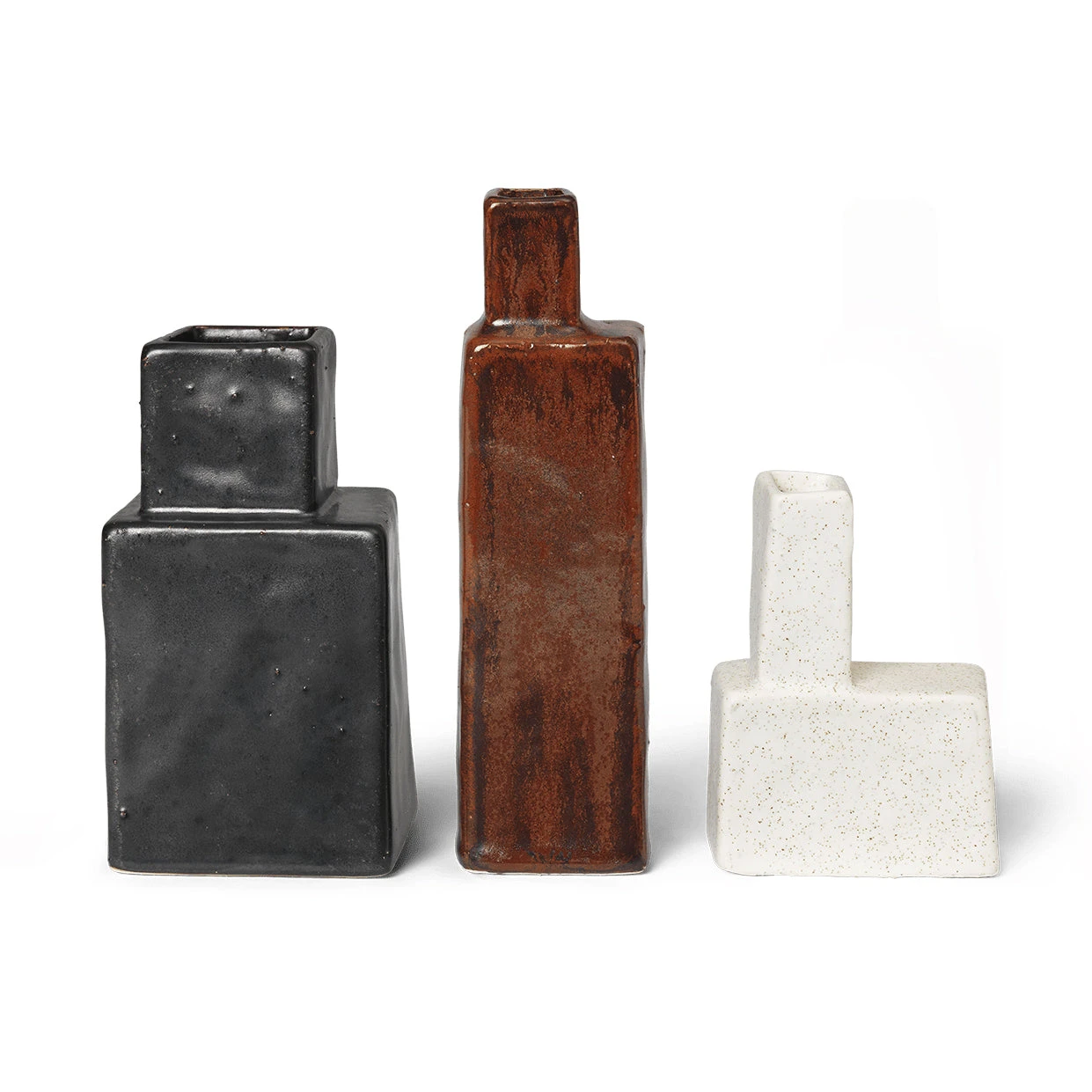 The Koa Family marries brutalist aesthetics with a rugged, handcrafted charm. Each vase features a unique geometric shape, evoking the beauty of architectural structures, while subtle imperfections in the glaze lend an artisanal touch. Featuring varying proportions and sizes, from tall and slender to squat and wide, they create a rhythmic, eye-catching composition. Perfect for showcasing a single flower, the Koa vases embody the strength and valour reflected in their name, which means ‘warrior’ or ‘valiant one.’ The set of three miniature vases makes a perfect gift for any occasion, whether for friends, family, or yourself.