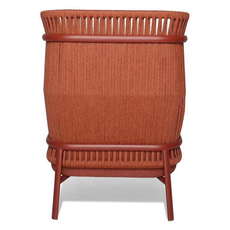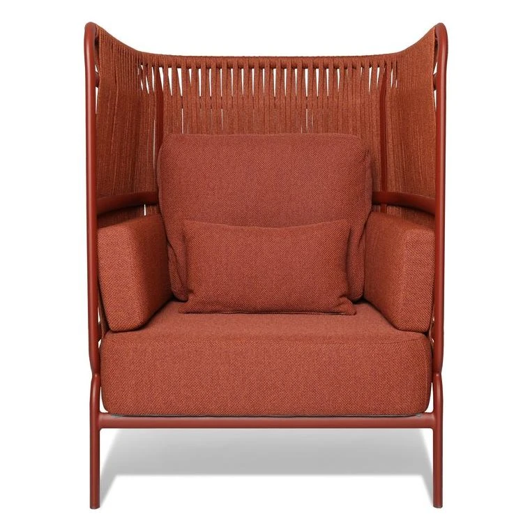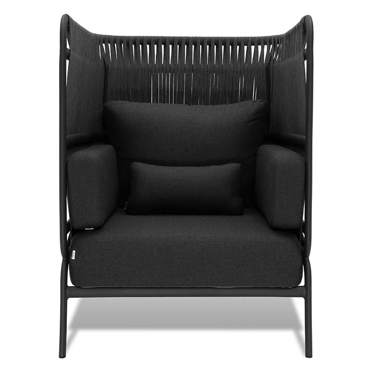 To complement the relaxed statement of the lounge group, a super comfortable lounge chair has been designed. Same unique weaving of ropes and details of alumimium frames to match the other family members. All hitting inside the cushion and not least the cushion – a thick comfy cushion for hours of relaxation. Designed by Odos Design.
