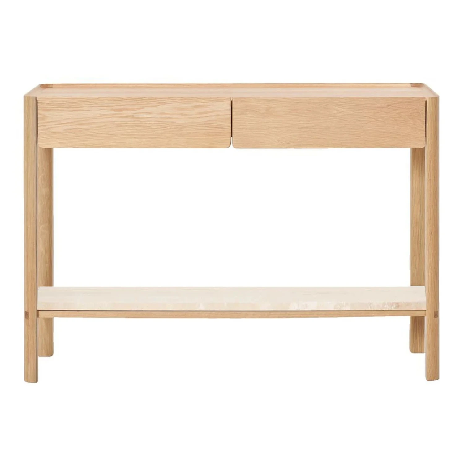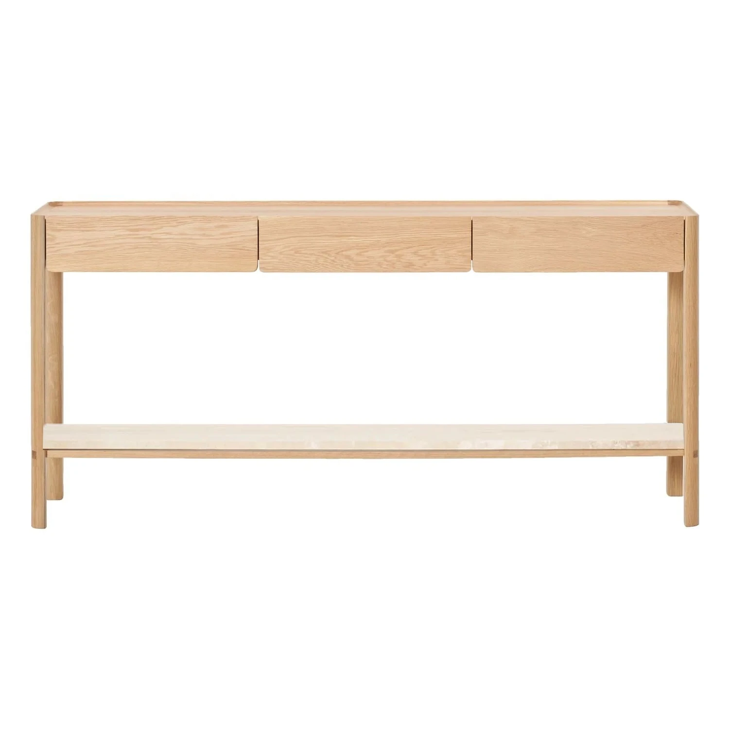 Nell Console is a composition of harmonious details that together form a unique statement piece. Each element invites attention and tactile interaction. The scalloped top shelf provides a safe storage surface, while the front edge opens convenient drawers. Braced with a marble or timber shelf. Nell is a celebration of authentic materials, craft and timeless architectural forms.
