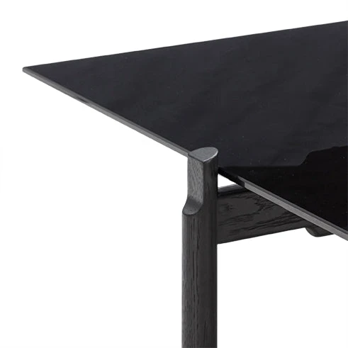 Offered in seven sizes and shapes – spanning round, square, and rectangular outlines – the Notch table series is distinguished by a striking graphic character accentuating the components’ inherent qualities. The semi-transparent tabletop is resting atop a frame in black stained oak, highlighted by remarkable notched cabinet maker details.