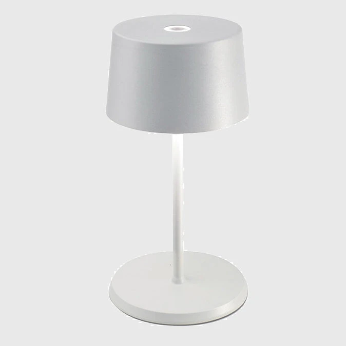 Olivia Mini Table Lamp by Zafferano Ai Lati Lights is a battery-operated, portable and rechargeable table lamp. It is equipped with a contact charging base and dimmer touch control.