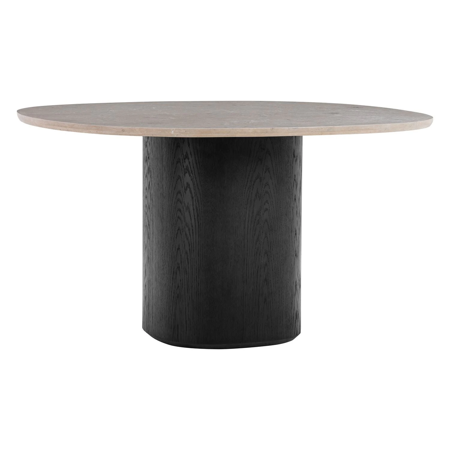 When introducing the Ovata Dining Table, the Ovata collection is further unfolded with an entirely new typology, the dining table. The almost monumental table effortlessly balances tactile surfaces, natural materials, and a pared-back aesthetics. The Ovata Table features a simple tabletop cast in matt-polished, Grey Jura limestone with subtle fossil markings, reflecting the unique terroir of its origin. The distinctive yet comforting rounded square shape of the tabletop is echoed in the sturdy column base, fostering pleasant transitions between the contrasting yet complimenting tactile surfaces, resulting in a design that radiates an understated luxurious feel. Crafted black stained oak veneer with visible grains, bevelled edge profiles at both tabletop and column base add lightness to the density of the solid materials. The centre-aligned column base as well as the generously sized tabletop leave plenty of room for up to six Ovata Dining Chairs, though the table works equally well with other seating styles and finishes.