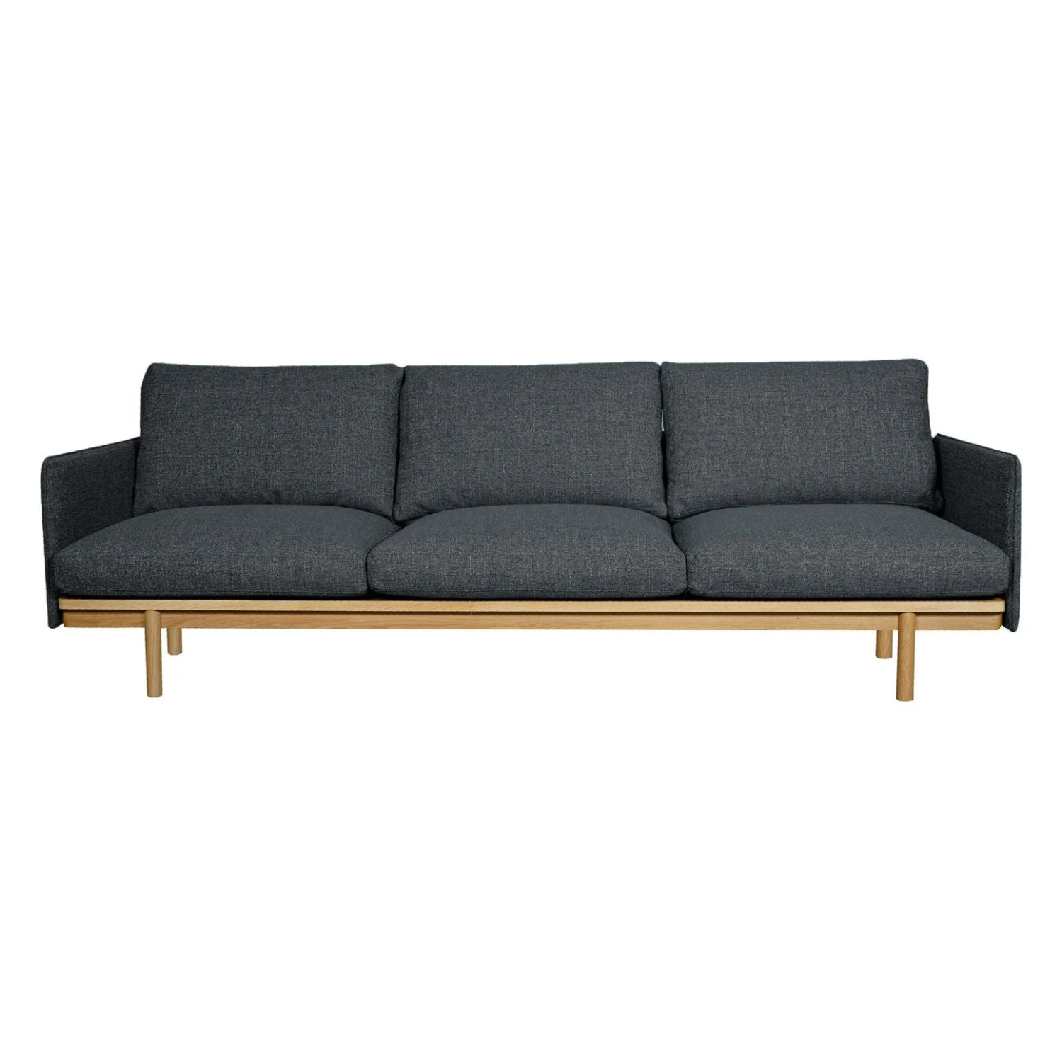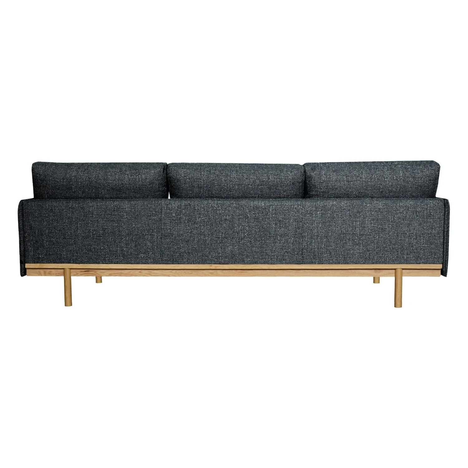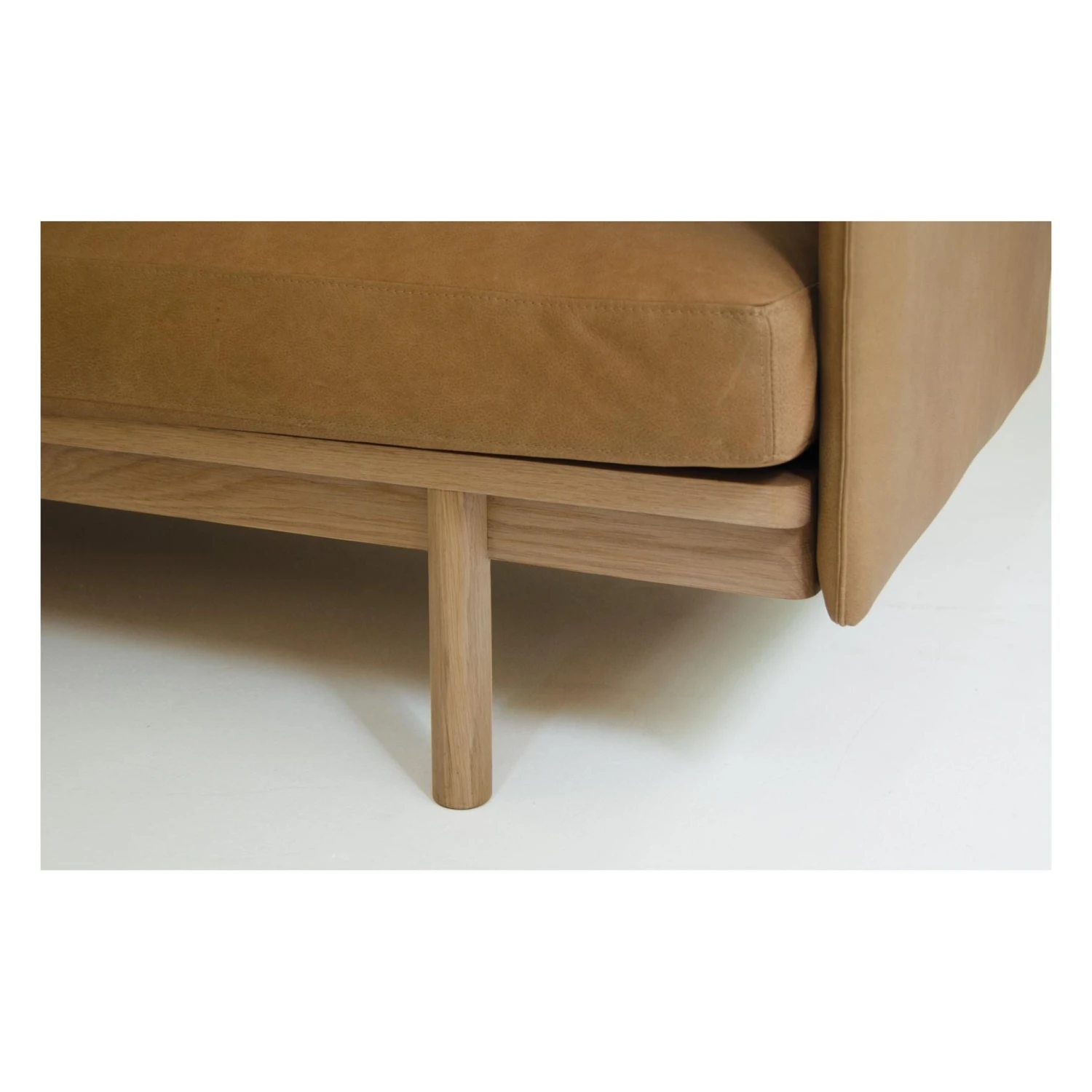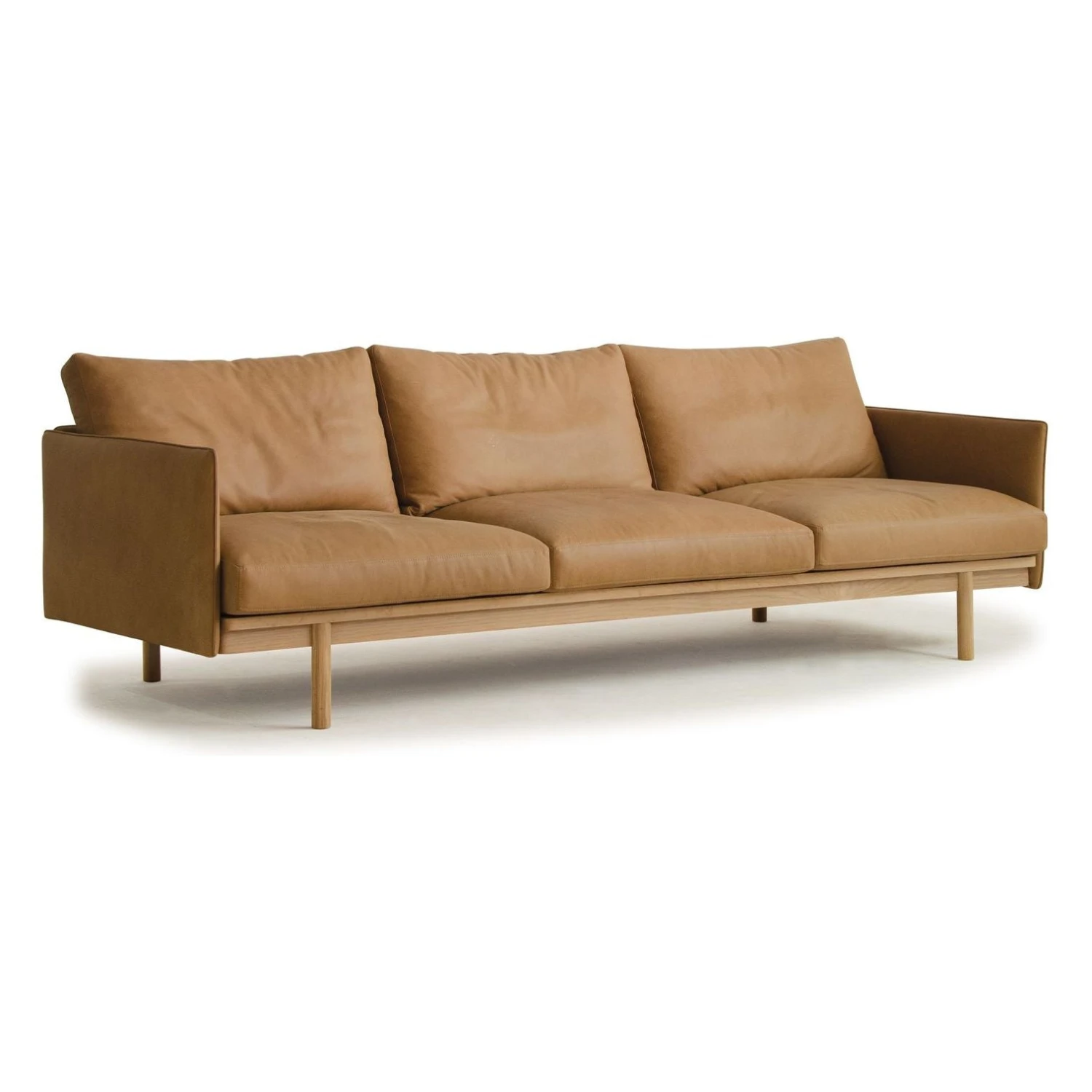 The mid-century inspired Pensive sofa offers both restraint and generosity. Ultra-thin arms bookend soft seat and back cushions, and the upholstered parts are underlined gracefully by a handsome wood base. Cylindrical legs intersect the plinthlike base to enhance visual interest — a rare detail that demands excellent craftsmanship.