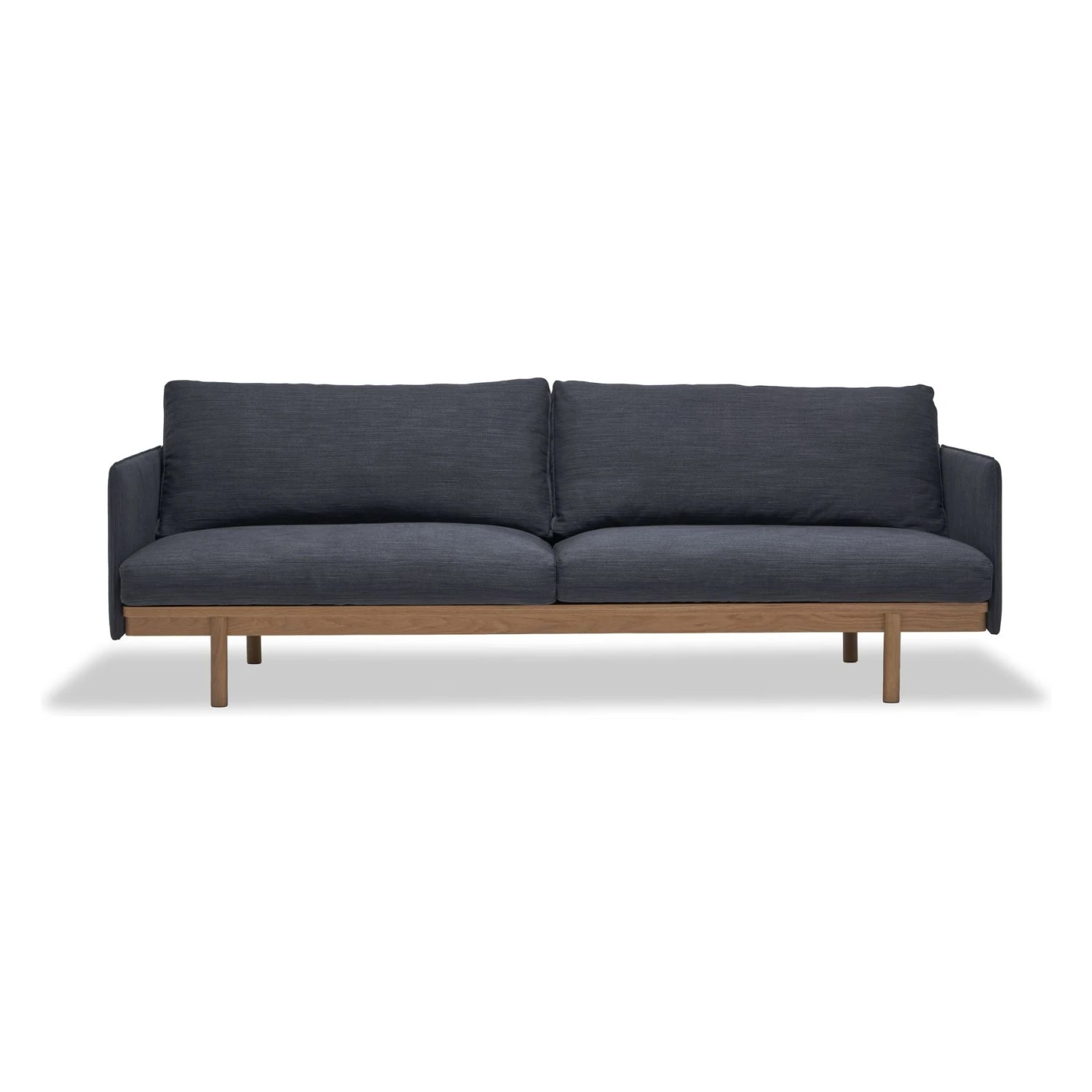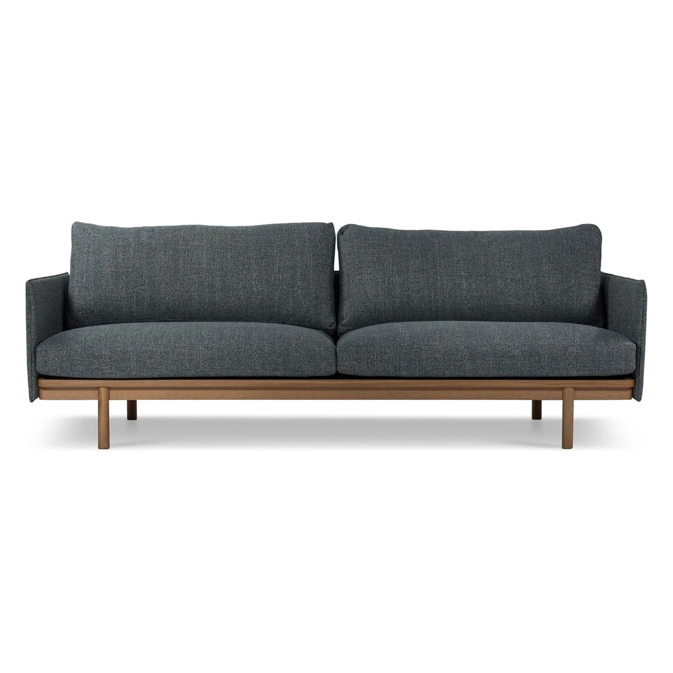 The mid-century-inspired Pensive sofa offers both restraint and generosity. Ultra-thin arms bookend soft seat and back cushions, and the upholstered parts are underlined gracefully by a handsome wood base. Cylindrical legs intersect the plinth-like base to enhance visual interest — a rare detail that demands excellent craftsmanship.