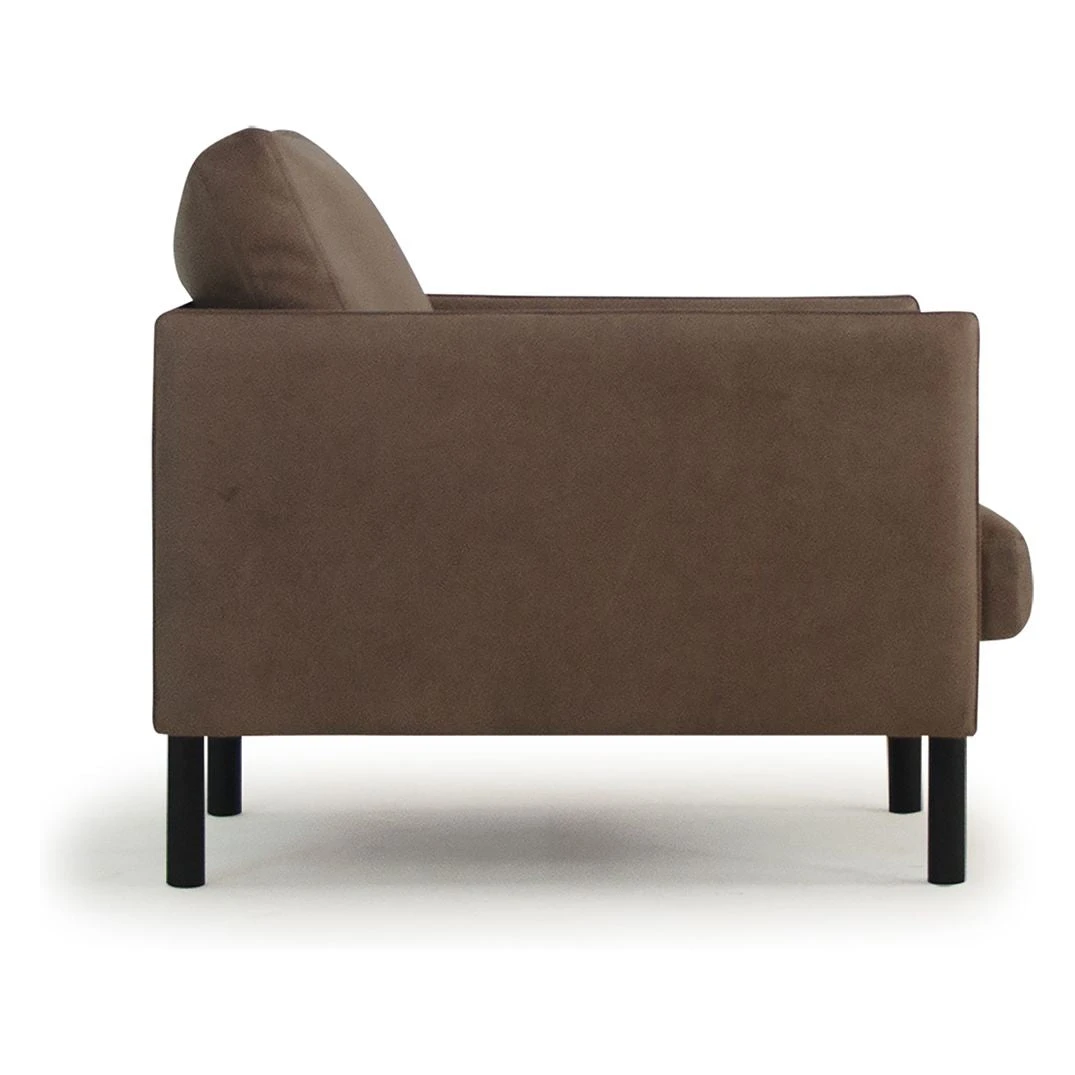 Cameron Foggo’s Pensive armchair deftly combines comfort and structure for a relaxing place to sit. It is characterised by thin planar arms, with soft seat and back cushions. Like the sofa of the same design, it has a wooden plinth base intersected by cylindrical wood legs.