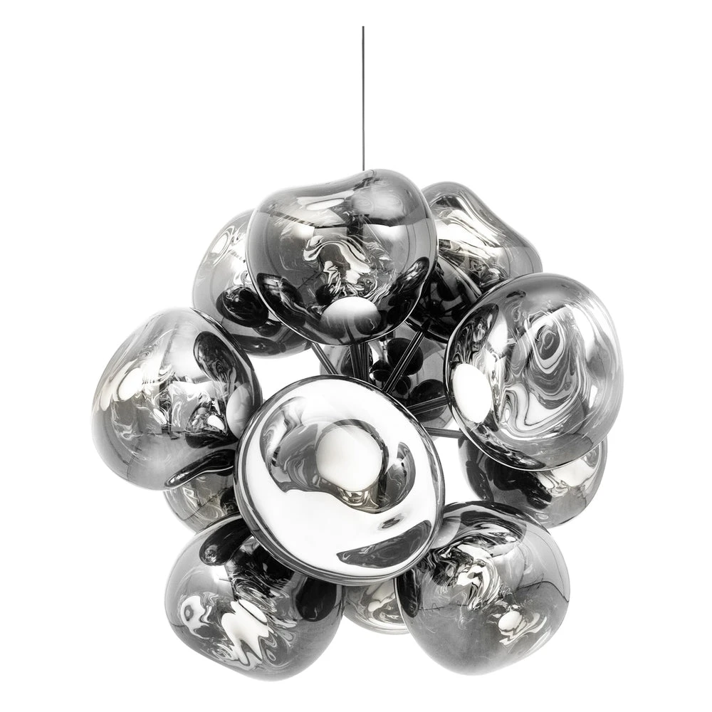 Melt is a beautifully distorted pendant in a modern Silver finish and matching ceiling rose. Featuring our intergrated LED module, this ceiling light creates a mesmirizing melting hot-blown glass effect when on and a mirror-finish effect when off. Made in Germany using a high tech manufacturing technique to achieve the perfect melted orb.