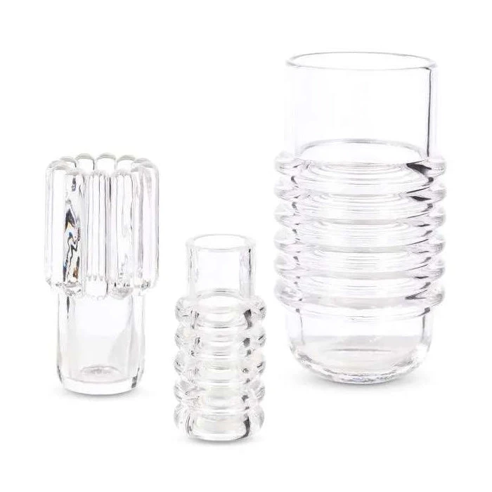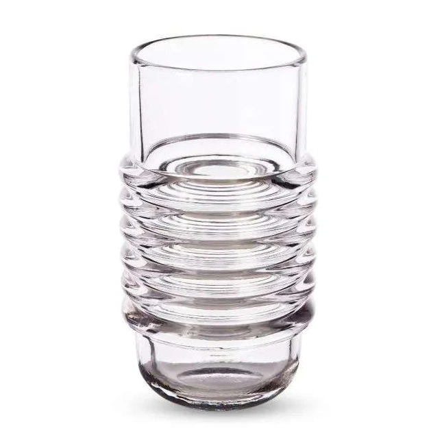 Press is a large vase, designed and engineered to catch and refract light, and to last for ever. This heavyweight grooved vase is made of fat, chunky coils of pure and clear transparent glass. Bold in silhouette and simple in function, it is manufactured by dropping big globs of molten glass at 1,200 degrees centigrade and pressed in two or three part iron moulds to create the immediately familiar silhouette.