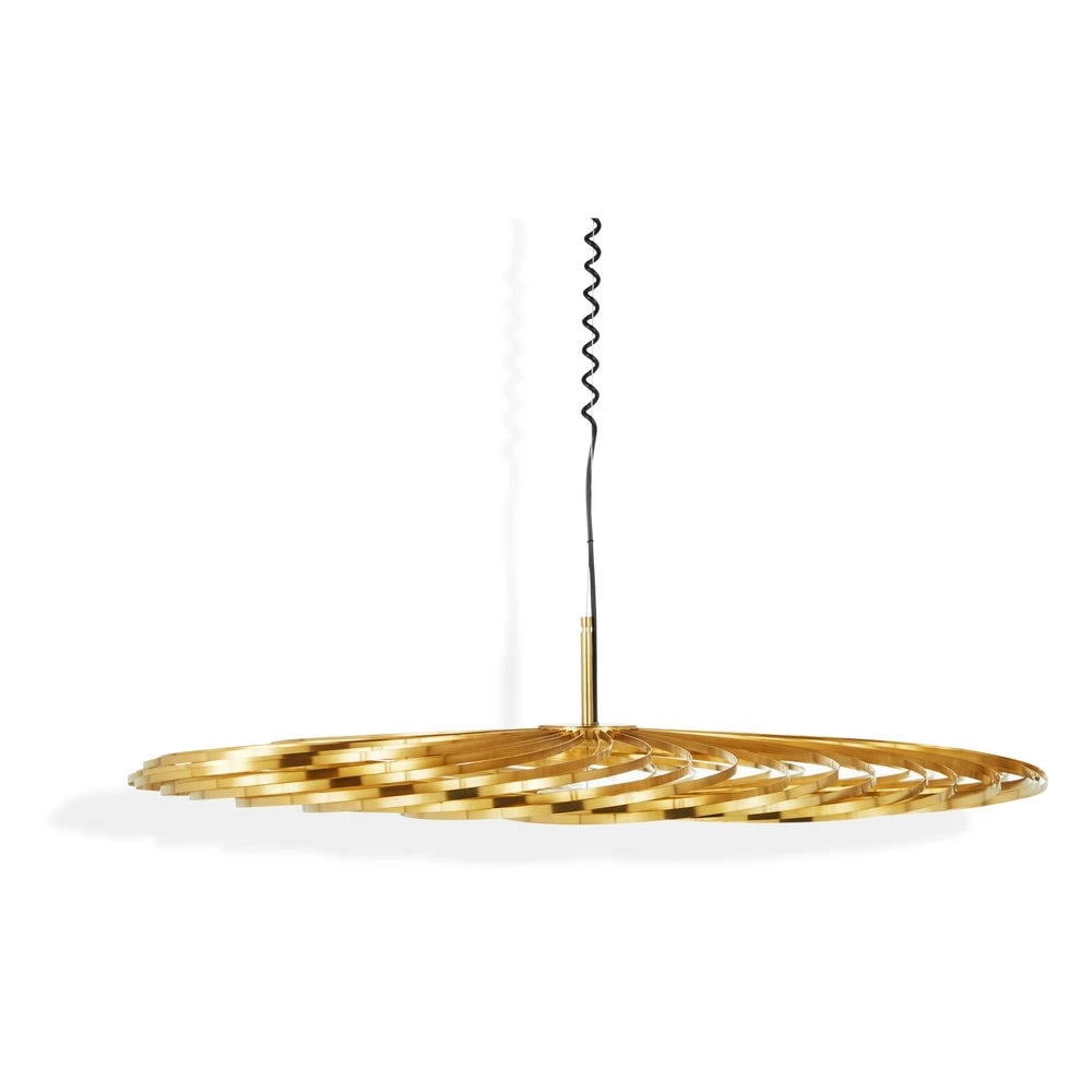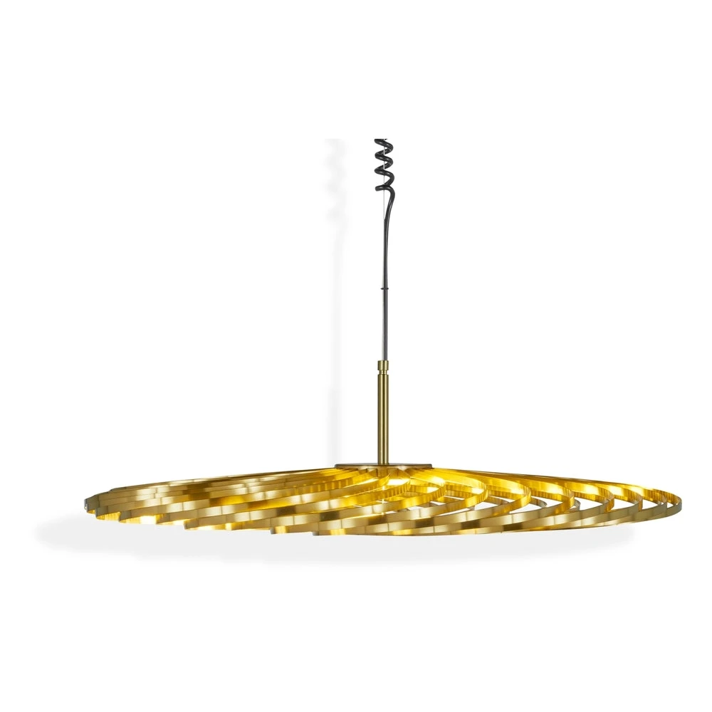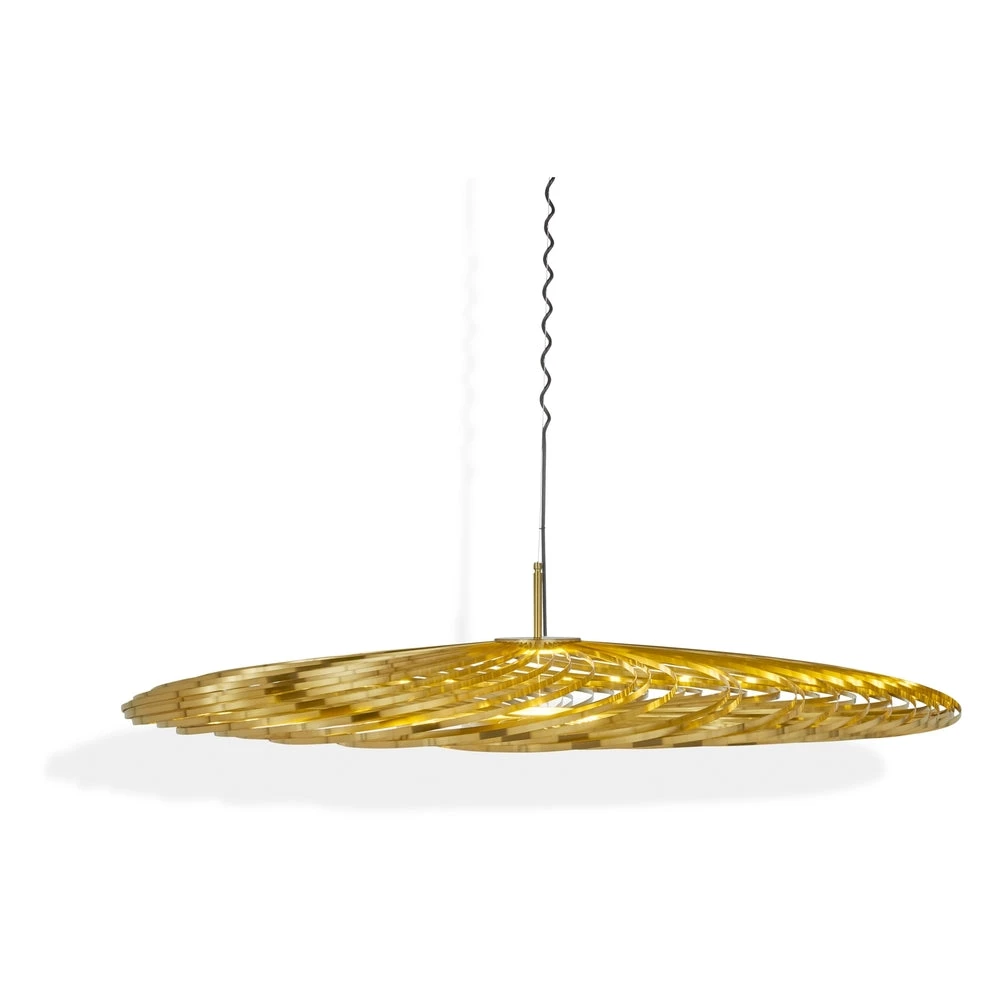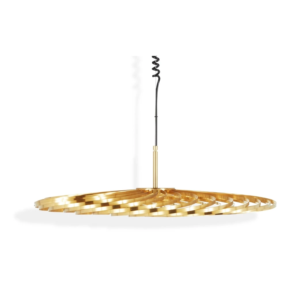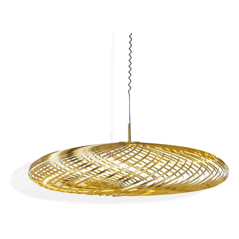 A ceiling light made from multiple bands of high-performance stainless steel in a brass finish. Pliant ribbons of stainless steel have been arranged like a whisk around our custom-made dimmable Tom Dixon LED disc. The semi-transparent shape thus created can be adjusted to a variety of silhouettes.